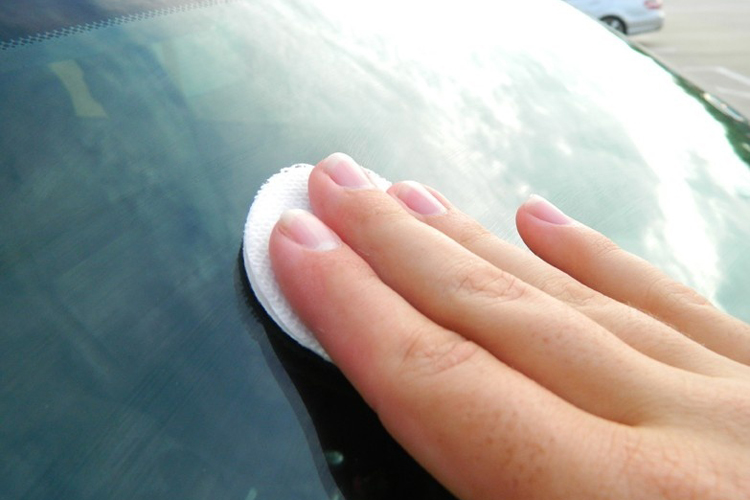 - Bước 2: Dùng khăn mềm (hoặc mút xốp) thoa đều dung dịch lên kính theo đường ngang dọc hoặc tròn.