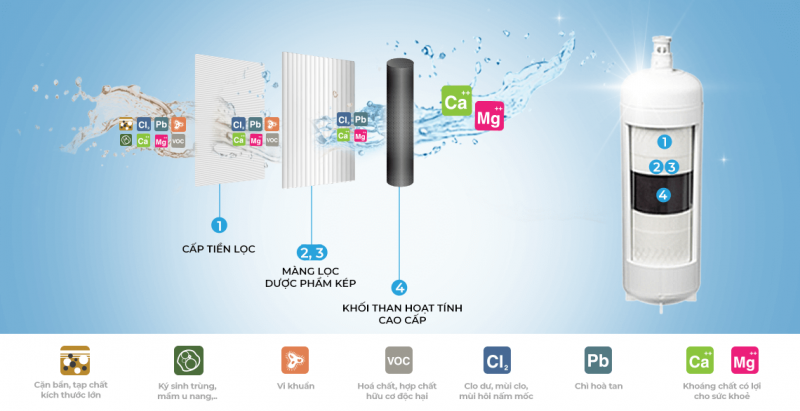 - Nước lọc ra đạt các tiêu chuẩn cao nhất trong bộ tiêu chuẩn nước uống trực tiếp của Hoa Kỳ.