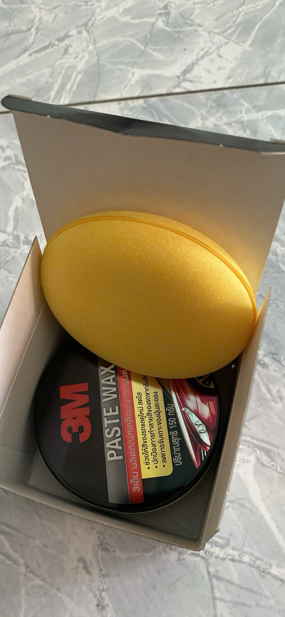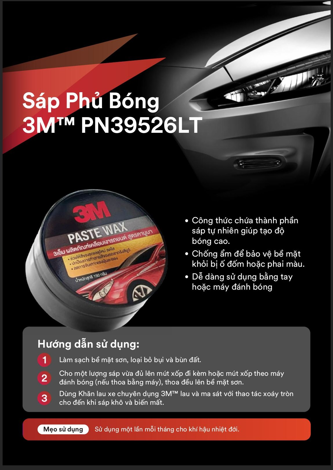 Bước 2:Dùng miếng mút (đóng kèm) lấy 1 phần sáp vừa đủ và xoay tròn đều trên bề mặt sơn. Thoa tác tương tự cho hết bề mặt xe